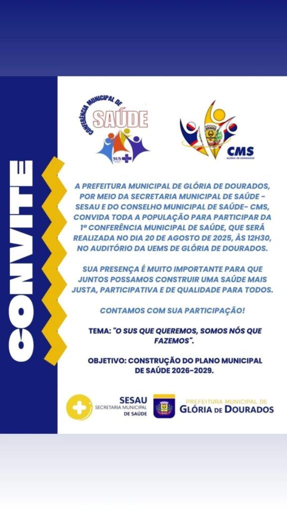 A prefeitura municipal de Glória de Dourados, por meio da secretária de saúde SESAU e do conselho municipal de saúde-CMS, realizou na tarde de quarta-feira, 20/06/2025, a 1ª conferência municipal de saúde, que foi realizada no dia 20 de agosto de 2025 no auditório da UEMS.